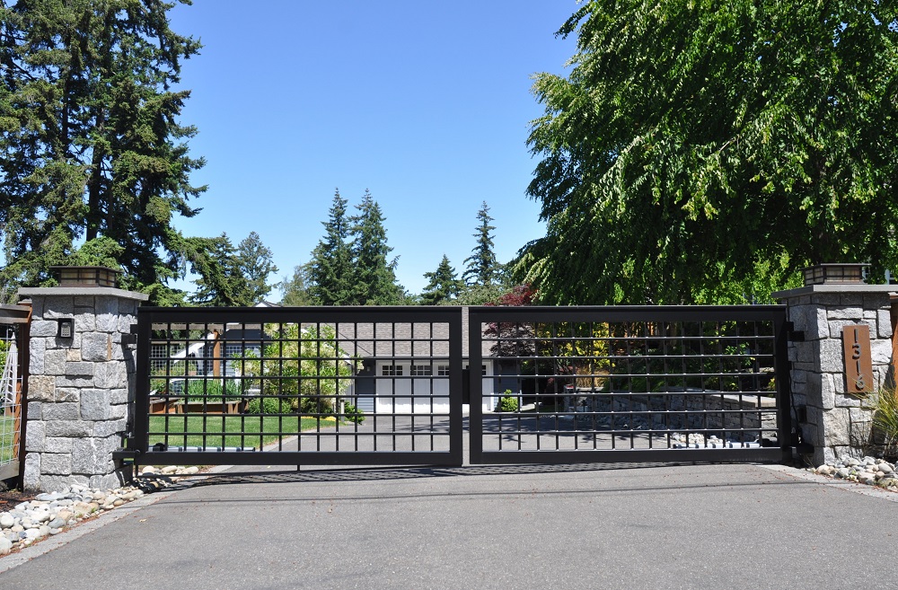 Double swing gate with square tube pickets intersected to create a square pattern. Access control includes a keypad mounted to the column for visitor access and single button remotes for the residents. This gate also includes a magnetic lock to provide additional security.