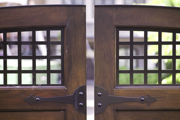 A double swing privacy-security gate with teak wood applique and metalmesh at the top. The faux hinge straps and custom teak lighting accessories add delicate detail to this impressive entrance.