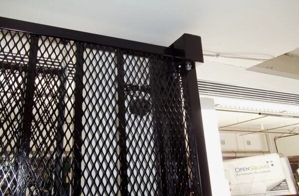 Sliding gate at parking garage. It features custom-fabricated expanded metal to fill the space between the pickets, reducing risk of injury.