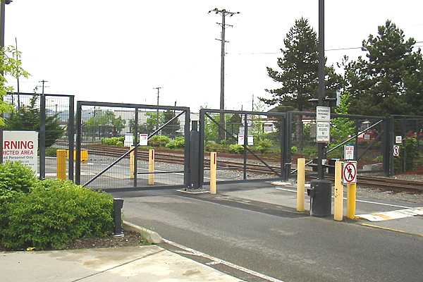 Industrial swing gate with mesh panels and separate enter and exit access.